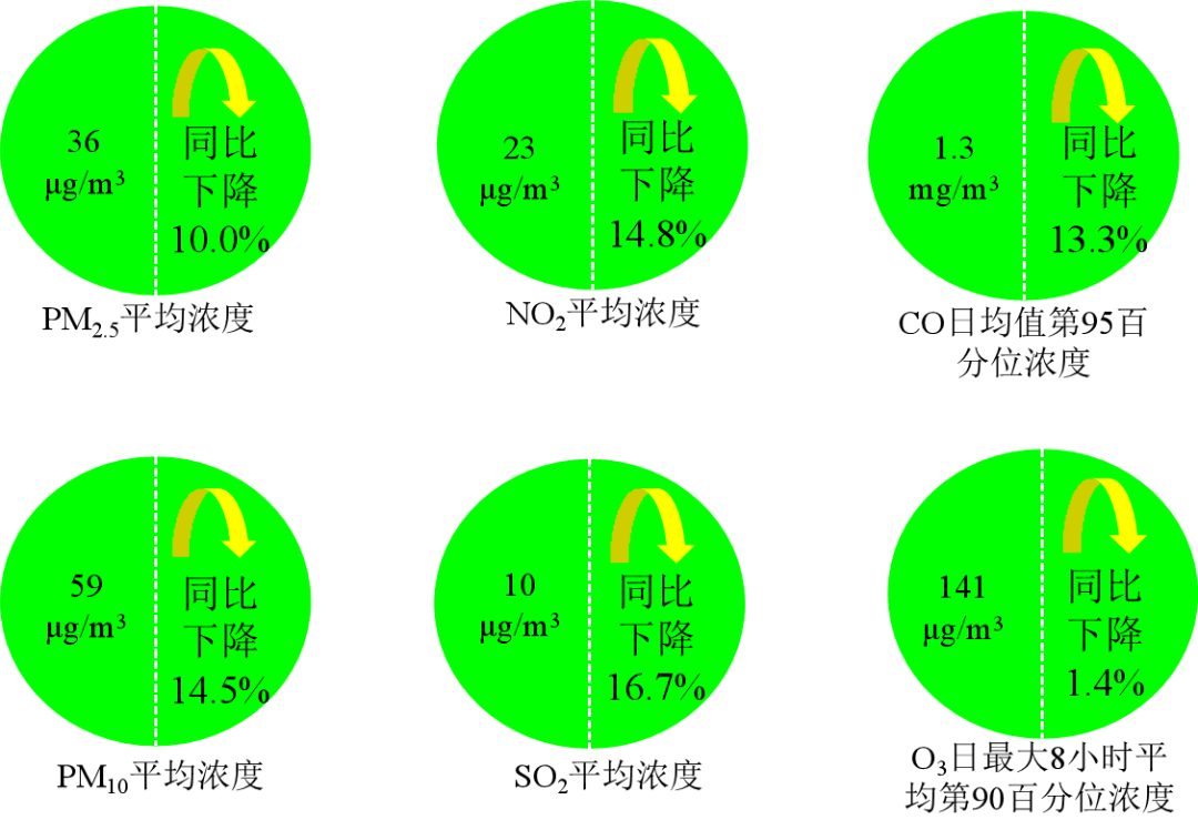 在環(huán)境空氣方面,全國337個(gè)地級(jí)及以上城市平均優(yōu)良天數(shù)比例為85.0%,同比上升4.9個(gè)百分點(diǎn);PM2.5濃度為36微克/立方米,同比下降10.0%;PM10濃度為59微克/立方米,同比下降14.5%;O3濃度為141微克/立方米,同比下降1.4%;SO2濃度為10微克/立方米,同比下降16.7%。